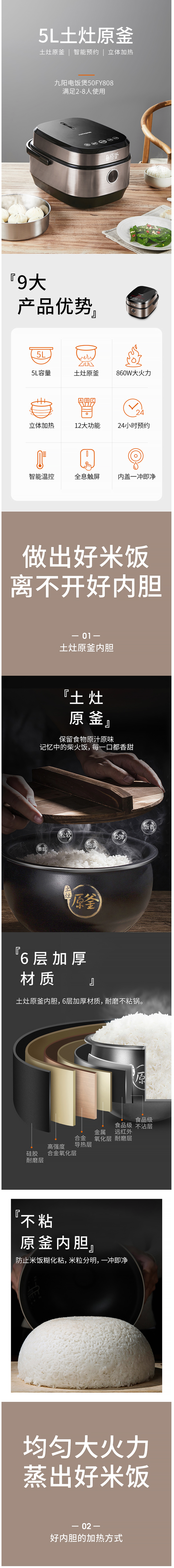 九阳F-50FY808 土灶原釜系列电饭煲,蒸出的米饭如同柴火饭一样,松软可口,最大限度的保留了米饭的原汁原味。顶部是无拼全息接触控面板,一体成型无拼接,油垢污渍一抹即净;5L大容量,可满足2-8人食量,还能24小时提前预约,