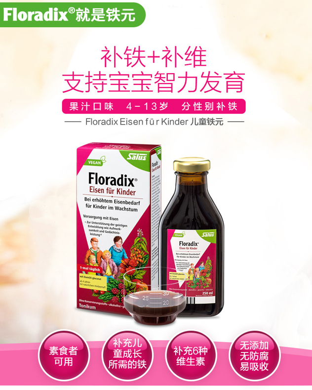 这款莎露斯Salus儿童铁元,德国原装进口,主要成分是葡萄糖酸铁、果蔬浓缩汁混合物:覆盆子果汁、胡萝卜果汁、玫瑰果、龙舌兰果汁、柠檬叶、印度樱桃、沙棘果、苹果、菠菜叶、绿燕麦草。