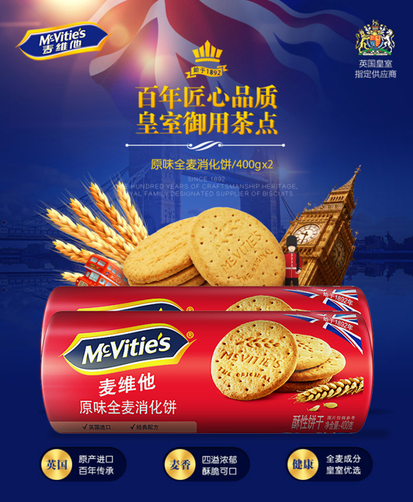 这款麦维他 原味全麦粗粮消化饼干,规格: 400g*2袋,英国进口,非油炸不油腻,采用优质原料传统英式烘焙工艺制作,酥脆可口,麦香浓郁,轻卡轻脂,好吃不胖。