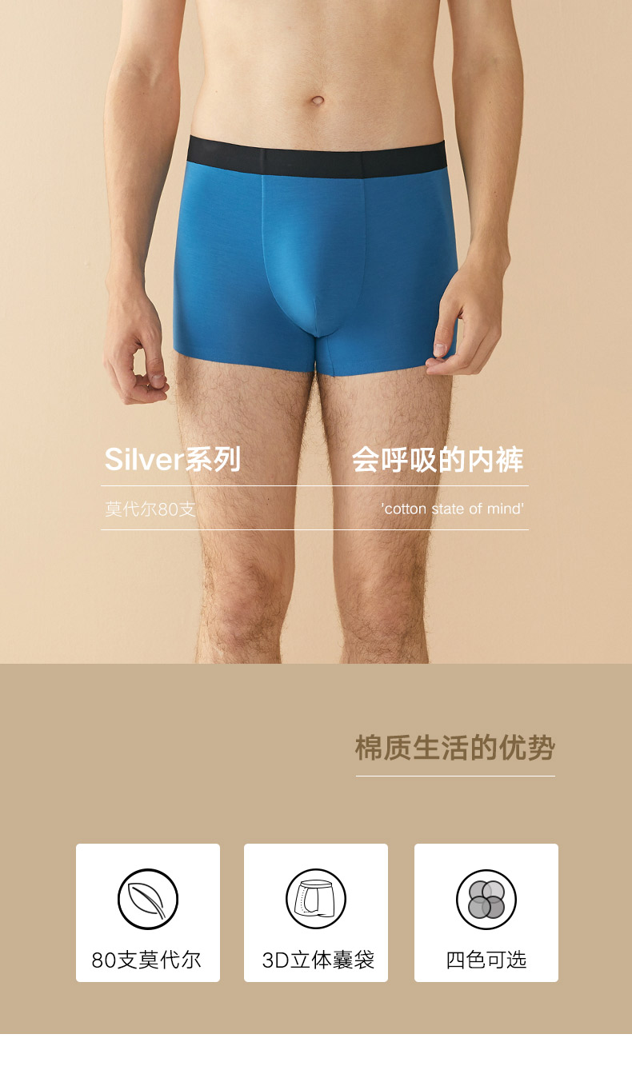 和纯棉面料相比,莫代尔手感更柔,吸湿更快更干爽,连续穿几天也没有棉质内裤松懈。莫代尔面料要混入氨纶弹力纤维,拥有弹力贴身的穿着感,又不会像尼龙或聚酯纤维有明显的紧绷感。