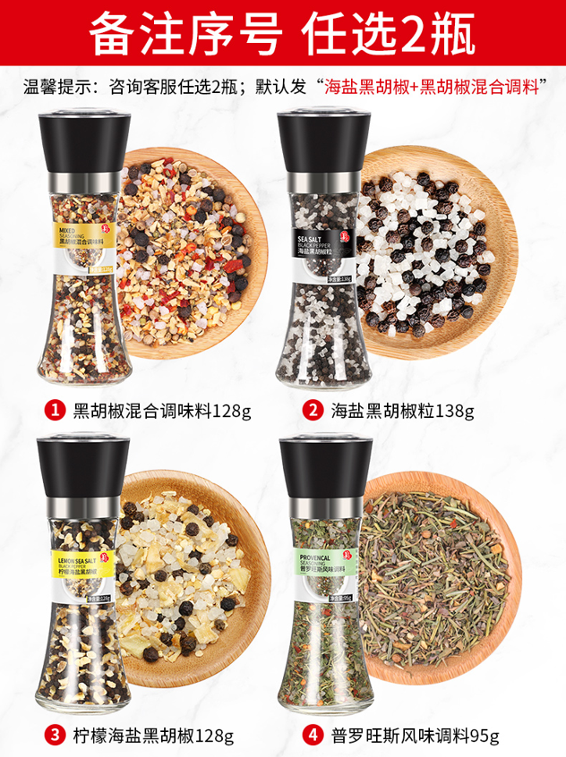 有鸡胸肉 健身调味料、黑胡椒、海盐黑胡椒粒、普罗旺斯风味调料、黑胡椒混合调味料这5种口味,任选2种。