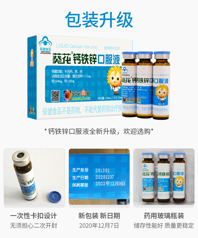 葵花品牌,线下药店都有卖,钙铁锌口服液儿童成长补钙,宝宝葡萄糖酸钙锌口溶液,一支补钙铁锌三样,每支含钙111.1mg、铁2.04mg、锌1.33mg液体钙易吸收。液体钙溶解度好,钙离子更易被吸收。适合儿童、孕妇、乳母等补充营养。旗舰店发货,品质靠谱。