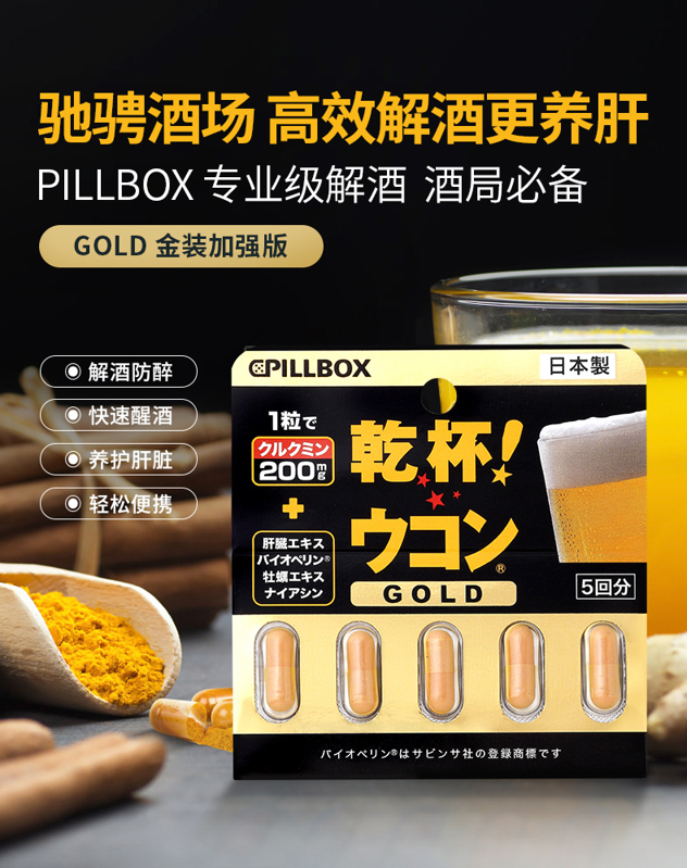 这款Pillbox 干杯EX姜黄解酒胶囊,日本进口,含有姜黄、黑胡椒、猪肝及牡蛎提取物,能生成肠胃保护粘膜,帮助阻断部分酒精吸收,活化醒酒酶,促进血液循环,加速排尿、排汗,以祛除体内的酒精代谢物,从而降低酒精对身体的伤害。能迅速增加人体能量,有效舒缓头晕虚脱、恶心呕泻、四肢无力等症状。
