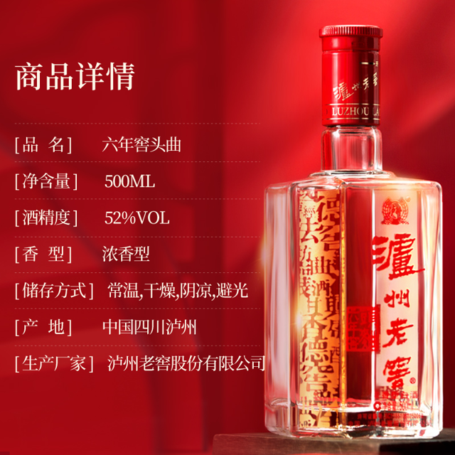 泸州老窖头曲是我国享有盛誉的名酒之一,素以“醇香浓郁,清洌甘爽,回味悠长,饮后尤香”的独特风格,闻名古今,畅销中外。酒体无色透明,窖香浓郁,清洌甘爽,饮后尤香,回味悠长。具有浓香、醇和、味甜、回味长的四大特色。