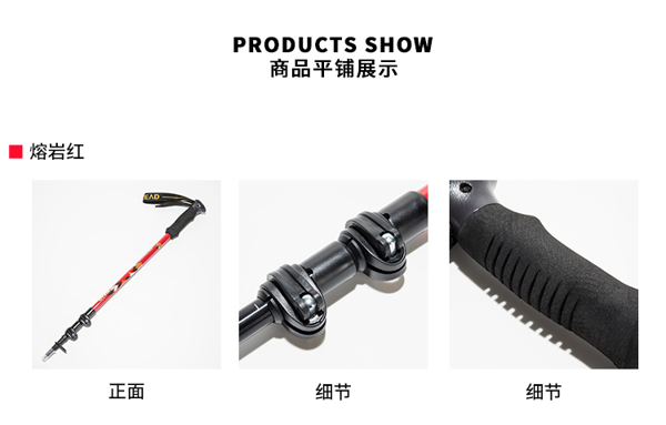 在细节上,手柄处有轻薄柔软材料的360°腕带,易于手掌穿入,同时舒适不摩手。仗尖位置可以伸缩,利用外锁装置固定,提供强大支撑力,操作方便。净重267g,规格是65~135cm。