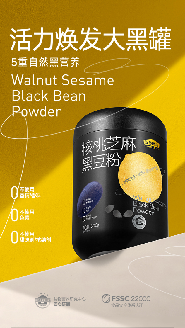 这款五谷磨房 高端 核桃黑芝麻黑豆粉,被誉为代餐届的“黑马”,入选了2018天猫双11全球食品巅峰榜,热销100万+,超98%好评。配方超强升级,核心成分来自云南的核桃仁>10%、鄱阳湖黑芝麻>23%、东北黑土地黑大豆>29%,特别添加了墨西哥奇亚籽、黑藜麦、黑米、山药等。