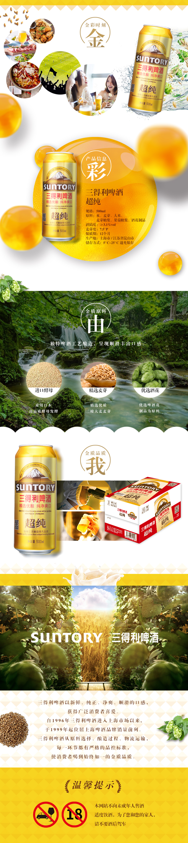 三得利啤酒精选优质二棱大麦麦芽,优质啤酒花为原料,采用日本高品质酵母发酵,从原料选择,酿造过程,物流运输,每一环节都有严格的品控标准,以新鲜、纯正、净爽、顺滑的口感,获得广泛消费者喜爱。自1996年三得利啤酒进入上海市场以来,于1999年起位居上海啤酒品牌销量前列。