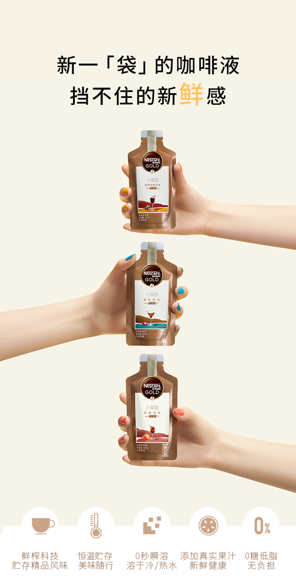 这款雀巢 金牌小咖曲咖啡液,精选咖啡豆,新鲜研磨成粉,快速冷却工艺,冷压萃取咖啡液,利用鲜榨果汁技术,添加真实果汁,新鲜健康,0秒瞬溶,0糖低脂无负担。