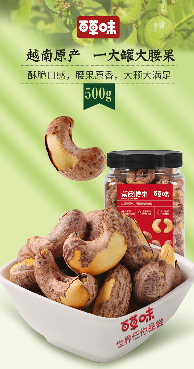 这款百草味 紫皮腰果,选用越南进口腰果仁,个大饱满,圆润的弧形如一轮弯月,经过8小时恒温持久烘烤,非油炸,果仁细腻白嫩,口感酥脆,焦香微咸,香飘四溢,不添加香精和色素,完全呈现果仁原有的色泽和美味。