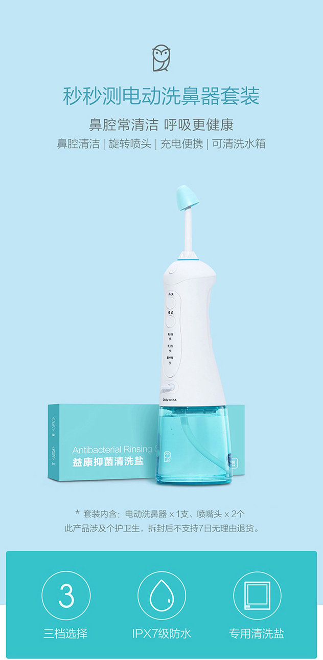 这款电动洗鼻器由小米生态链企业生产,可缓解鼻塞、鼻炎、鼻窦炎等症状,使鼻腔保持干净健康的环境,共拥有三档水流模式: