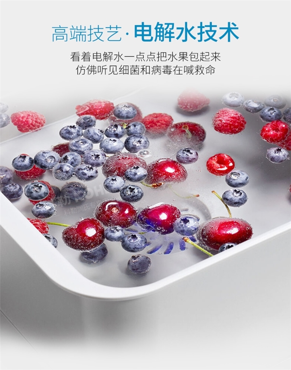 这款科勒的果蔬清洗机,采用电解水的技术产生氢离子和氢氧根离子,结合水中氯离子产生次氯酸,带有强氧化性和漂白作用,用以杀灭细菌降解农药,可用于清洗蔬菜和水果,也可用于厨具消毒,可根据使用情况,将发生器至于篮子或者水槽中。三档计时控制,自动断电,安全省心。
