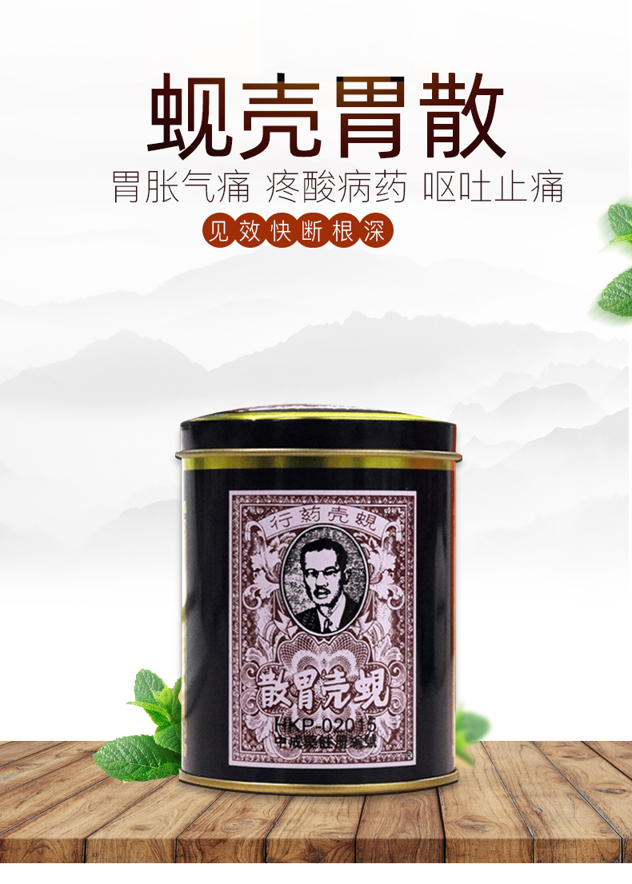 蚬壳胃散是香港著名的胃病“神药”,主要成分为海螵蛸、丁香、石脂、大黄、薄荷等,纯中药制剂,小童、孕妇均可使用,专治胃病,胃酸过多、腹胀、气痛、反胃等,内含标准茶匙,每次2平匙,重症加倍,小儿减半,服药时不可服茶,肾功能不全者禁用。
