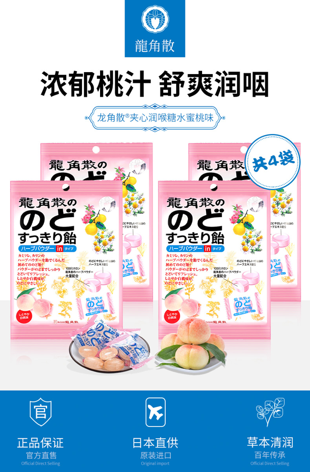 这款龙角散 水蜜桃味夹心润喉糖,日本原装进口,是粉末和夹心的双重润嗓,直接作用于咽喉粘膜,性质温和,食用安全。添加的龙角散草本微粉均匀散布在润喉糖中,配合有益于咽喉的清新草本萃取物,持久护嗓。