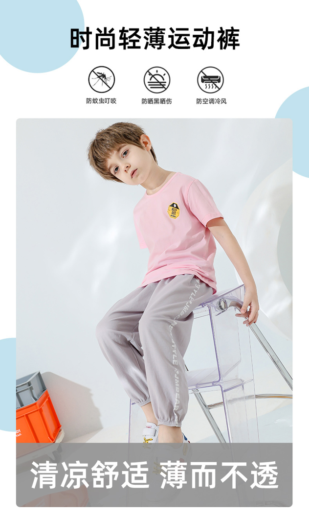 杰米熊 2021春季新款男女童轻薄冰丝休闲运动裤,冰丝透气面料,舒适清凉,薄而不透;宽松的哈伦裤版型,既舒适又兼顾运动感;弹力裤腰,弹性适宜不勒腰;侧边印花字母点缀,简约时尚又百搭;松紧裤脚,裤脚不易上跑,防蚊效果好。