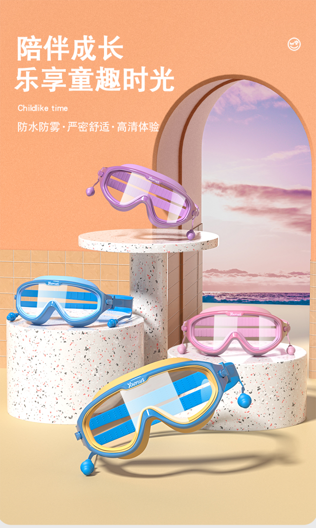 高清大框防水防雾镜片,3D人体工程学设计,贴合性好,泳镜硅胶垫圈覆盖面积更大,吸附力强,佩戴舒适不勒,防水密封性能更好,加大镜片水下视野更清晰,孩子更喜欢。
