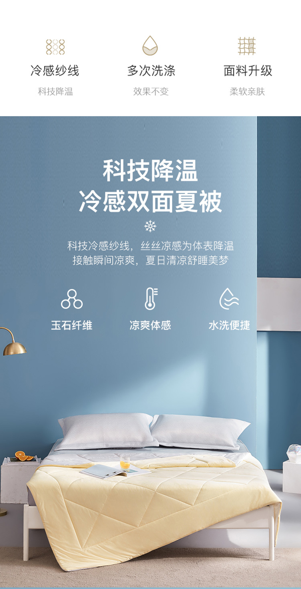 全新织造工艺,平滑不易勾丝。由韩国国家技术研究院协同日本实验室验证研发“E-care抗菌技术”,抗菌粒子均匀分布在纱线内部和表面,抗菌时效长久,被子周围还有精美双线包边,让被子经久耐用。可机洗打理非常方便。