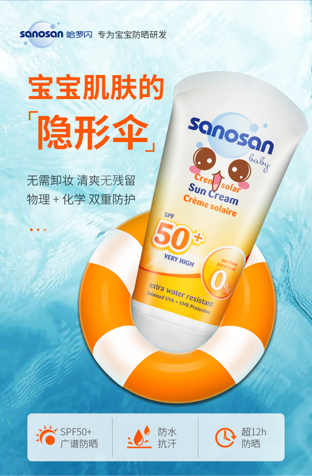 天猫sanosan海外旗舰店129元,可领80元优惠券,实付49元到手。这款德国进口sanosan 哈罗闪 宝宝儿童防晒霜SPF50+ 75ml,甄选天然植萃成分,物理+化学复合防晒,全面抵御UVA、UVB、IRA,轻薄透气,不油腻,肌肤水润,防水抗汗,遇水成膜,解决宝宝户外防晒伤难题。无需卸妆,清爽无残留;耐晒12小时高陪防晒,一整天无惧骄阳。