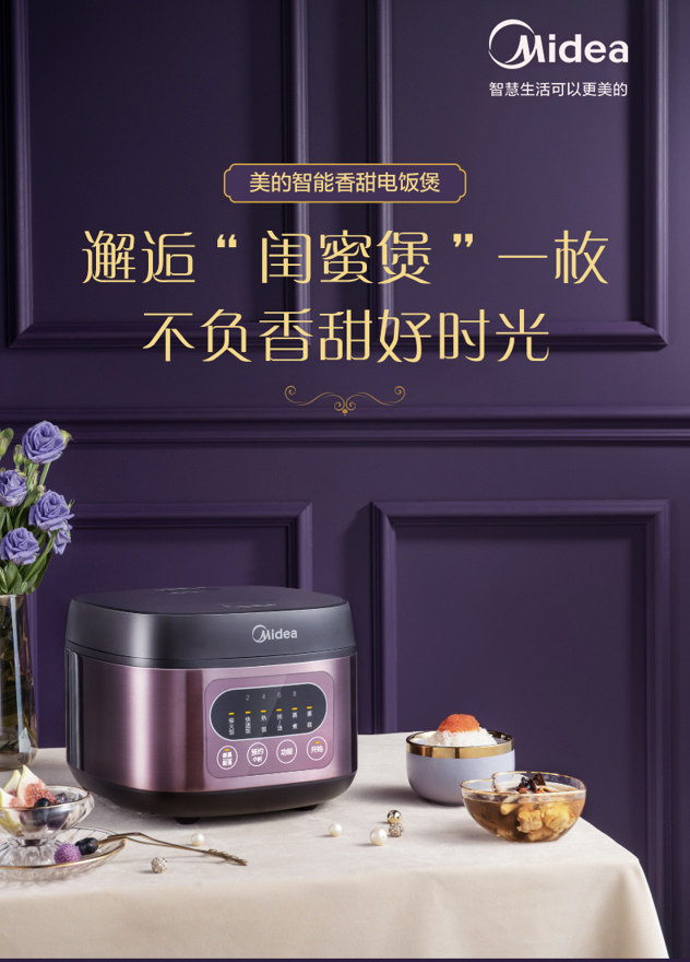 这款Midea 美的智能香甜电饭煲 ,容量:4L,外观简洁圆润,搭配拉丝机身,手感舒适。6大功能,一键智能操作,轻松烹制,美味随享。1.5mm黑晶聚能内胆,远红外不粘层,健康不粘,黑晶聚能,米粒更软糯香甜。蒸汽阀与上盖凸点设计,蒸气焖饭,激发米饭香气,智能感温探头,精准测温控温,米饭不粘底。4L大容量,满足多人就餐,轻松招待。