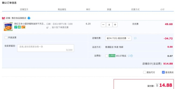 天猫豫吉食品旗舰店6.2元,有满49元减24.72元活动,下单8件可领10元优惠券,实付14.88元到手,共100g*8袋,每袋约40个,经典海盐口味。