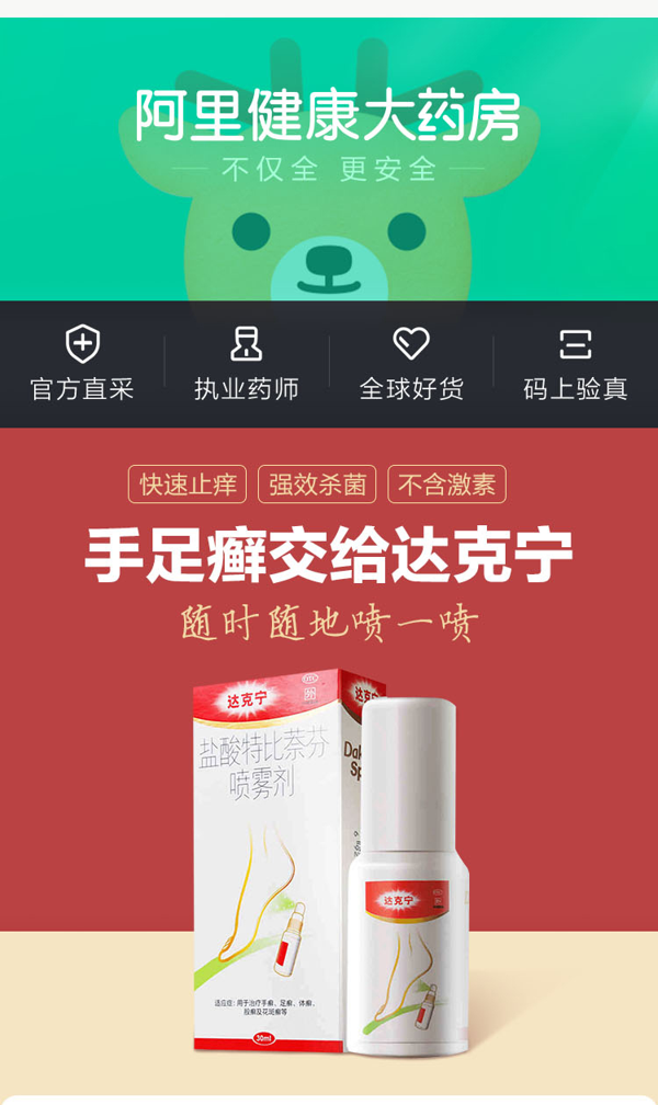 这款达克宁 盐酸特比萘芬喷剂,针对症状专门研制,主要成分盐酸特比萘芬,能深入杀菌专治脚气,液体制剂,特含酒精,喷涂后能快速渗透,规格是15ml。领券链接点此