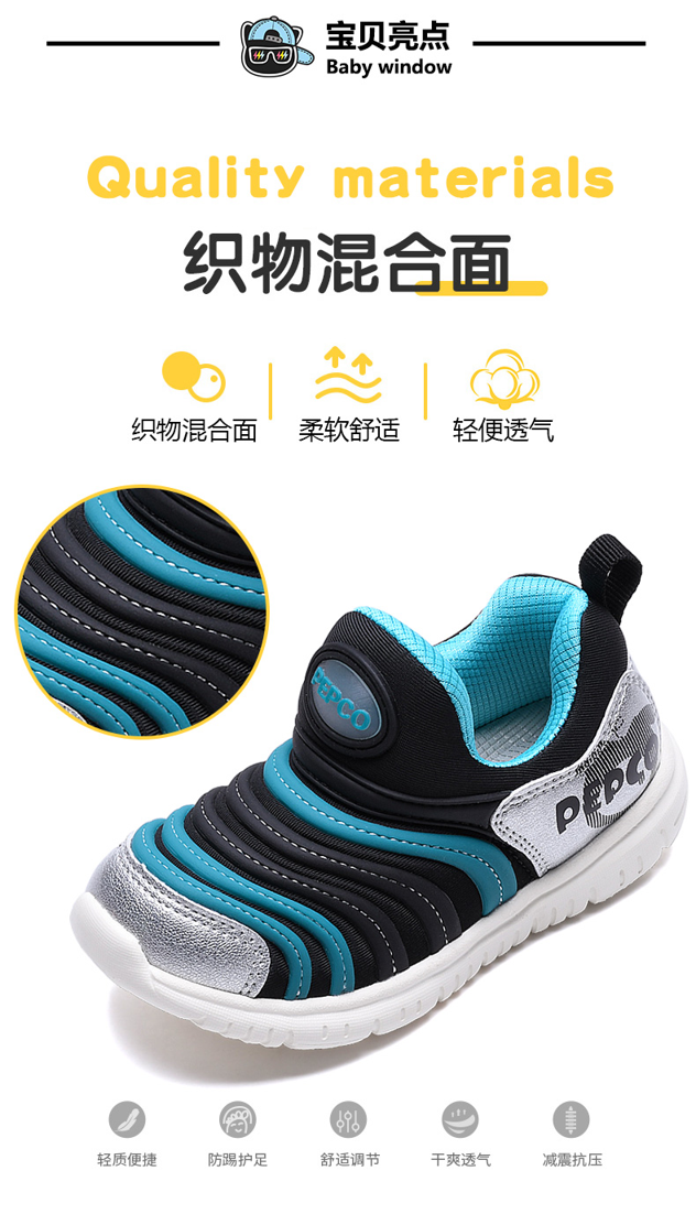 这款PEPCO 小猪班纳 2021夏季新款男/女童毛毛虫运动鞋,织物混合鞋面,柔软舒适,轻便透气;鞋子三分之一处弧形弯槽设计,柔软易弯曲,平衡受力,行走舒适;弹力鞋口更易穿脱,一体式免鞋带设计,轻松一脚踏平。MD柔韧大底,科学纹路设计,柔软缓震。