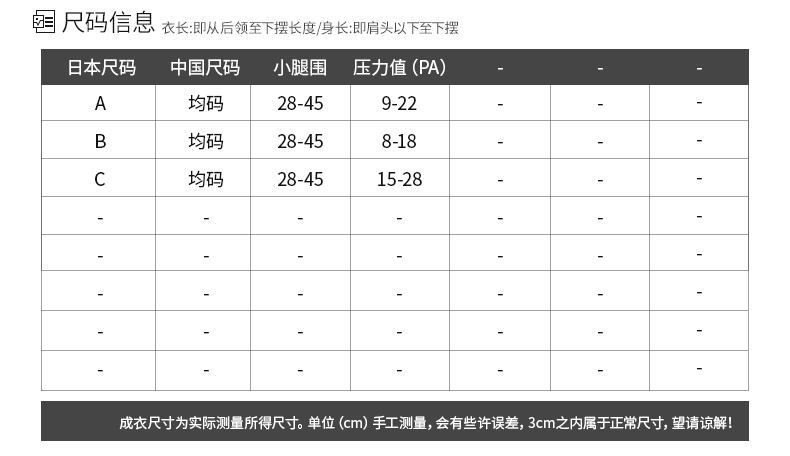 Cecile赛诗丽品牌是日本国内著名的大型邮购公司之一,引领着日本功能文胸内衣及时尚界的潮流。这款Cecile 赛诗丽 睡眠美腿塑型压力袜,将脚踝、小腿、大腿完整的包覆,内外都有缝制柔软材质,膝部是柔软网状物编织,踝肋骨贴身设计,美腿塑型,阶段式设计构造,压力平均,防静脉曲张,促进腿部血液回流,睡眠的同时减缓腿部紧张感,无痕不伤肤,无脚尖设计,四季适用。A、B压力:面料采用65%棉+30%尼龙+5%聚氨酯,C压力:面料采用47%棉+42%尼龙+12%聚氨酯。