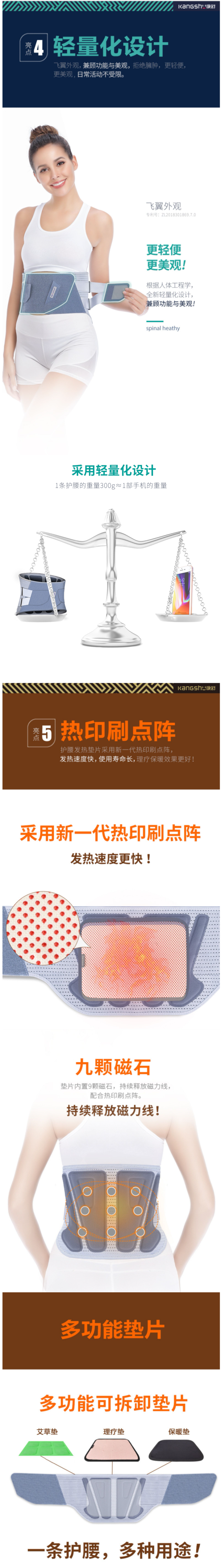内置双向加力带,佩戴后辅助腰肌发力,缓解腰肌疲劳,新增护腰发热垫片,使用新一代热印刷点阵,发热速度快,使用寿命长,理疗保暖效果更好,垫片内置9颗高能磁石,持续释放磁力线,配合热印刷点阵,以达到良好的理疗效果,垫片可拆卸,可更换为保暖垫和艾草垫,可根据自己需求拆卸更换。