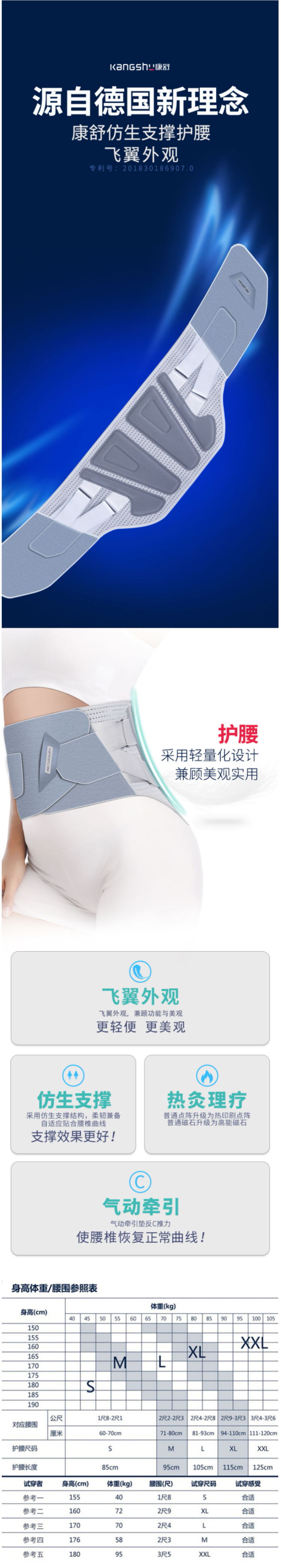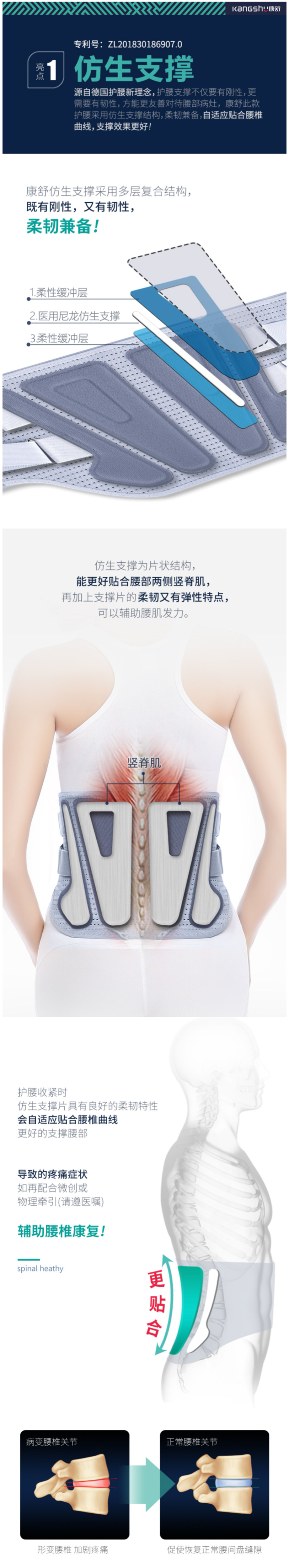 这款康舒仿生软骨护腰带是国家实用新型专利产品,使用软骨支撑,腰部双重加力技术和德国热压工艺,柔中带硬,软硬适中,自适应贴合腰椎曲线,能有效的支撑腰部,舒缓脊椎压力。