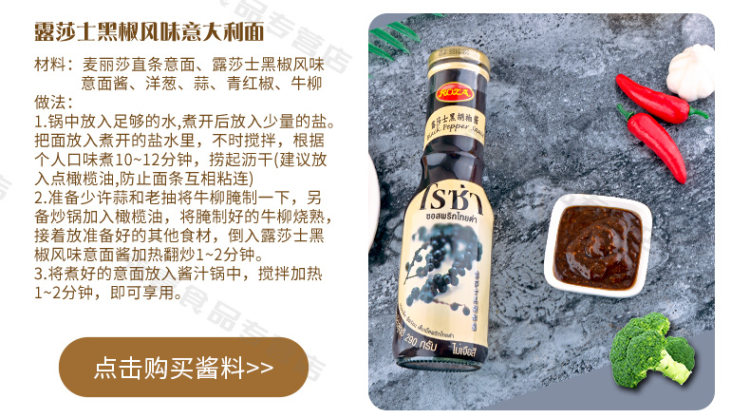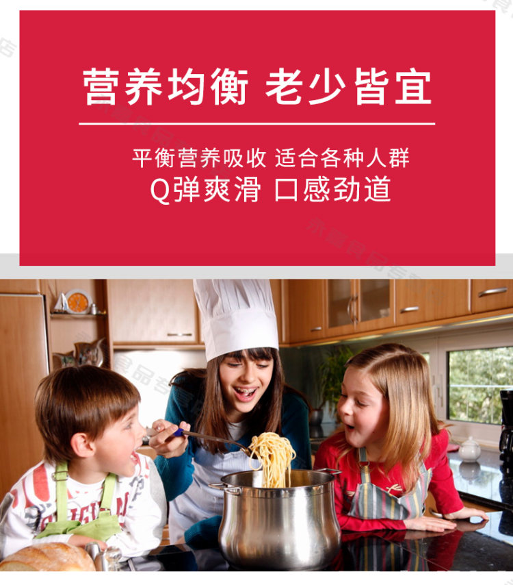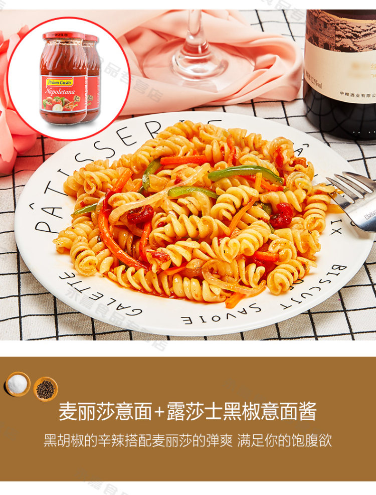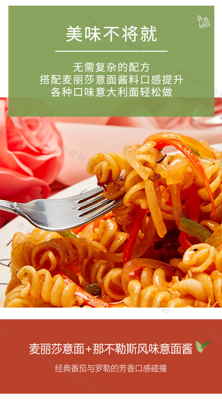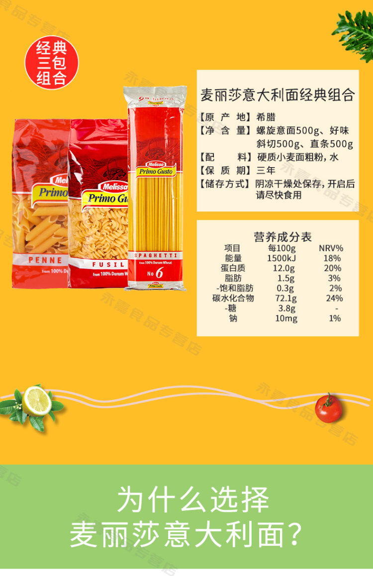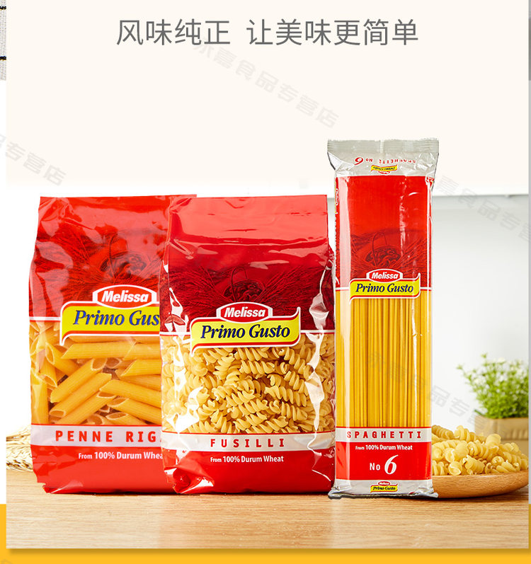 制作方面也很简单方便,无需复杂配方,只需煮熟搭配各种口味的意面酱,点缀一些水果蔬菜,一盘完美的意大利面便制作完成了。规格:500g*3袋 可供15人食用。