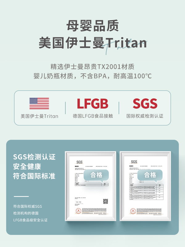 “Tritan”是目前公认最安全食品级塑料,由美国伊士曼/Eastman公司在2007年发明的。这种新型材料解决很多传统塑料的弊病,韧性好,冲击强度高,耐化学品,透明高,可耐100度沸水。关键还没有传统塑料的双酚(BPA)、双酚S(BPS),已通过FDA“美国食品药品监督管理局”安全认证。