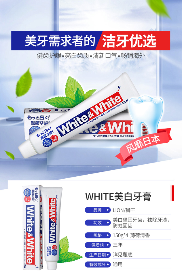 规格是150g*4支,合12.3元/支。这款狮王 美白牙膏,日本原装进口,泡沫丰富,有美白坚固牙齿,祛除牙渍,防蛀固齿的功效,清爽薄荷香气,清新口气无异味;
