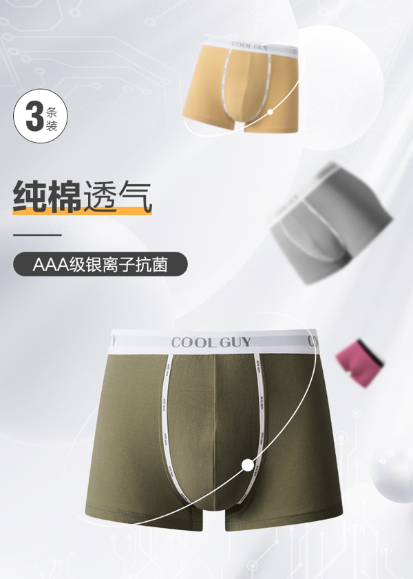 这款Semir 森马 男士40S纯棉银离子抗菌平角内裤 ,精选新疆长绒棉,精梳工艺制程,吸汗透气,亲肤健康,40S纱线织物密实,耐磨有质感,里档采用抑菌网眼面料,有效抑制细菌滋生,0荧光剂更安全,宽边高弹力滑沙橡筋,不紧绷无勒痕,立体空间囊袋,双层保护,更加人性化的烫印标签,舒适自在,无拘无束。