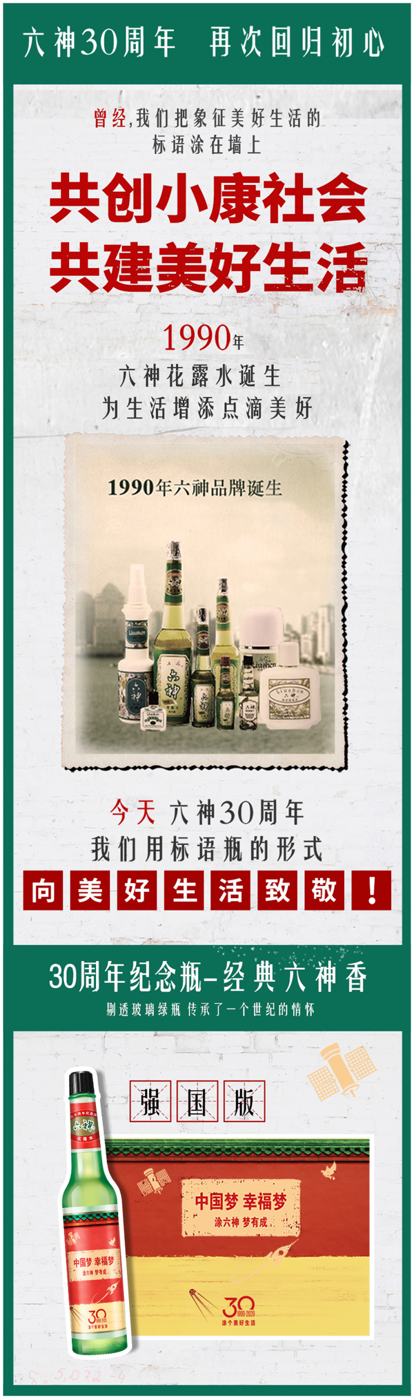 1990年第一瓶六神花露水上市,绝对经典系列,去痱止痒、提神醒脑,不可替代的童年同款香味,玻璃瓶六神永远滴神。