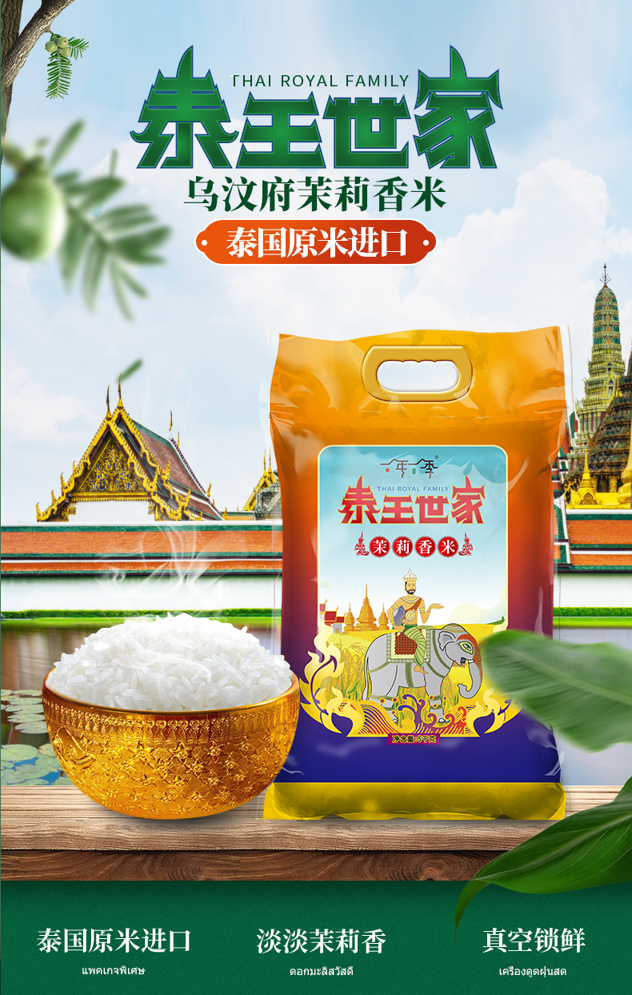 米粒晶莹剔透,色泽温润,均匀修长,颗粒饱满,蒸煮后醇正芳香,气味甘甜。真空包装,内层厚实,能牢牢锁住泰国香米的原始高品质,还能防水防潮,提高香米储存时间,