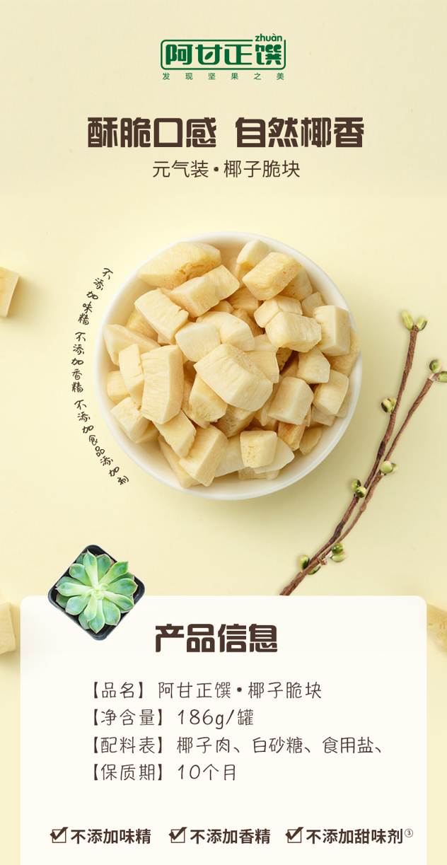 这款阿甘正馔 椰子脆块,精选新鲜成熟、果肉饱满的椰子,经过水煮脱油、头道烘烤、二道烘烤制成,将鲜果制成干果过程中,保留了椰子肉的自然清香,入口绵密酥松,香甜满溢。