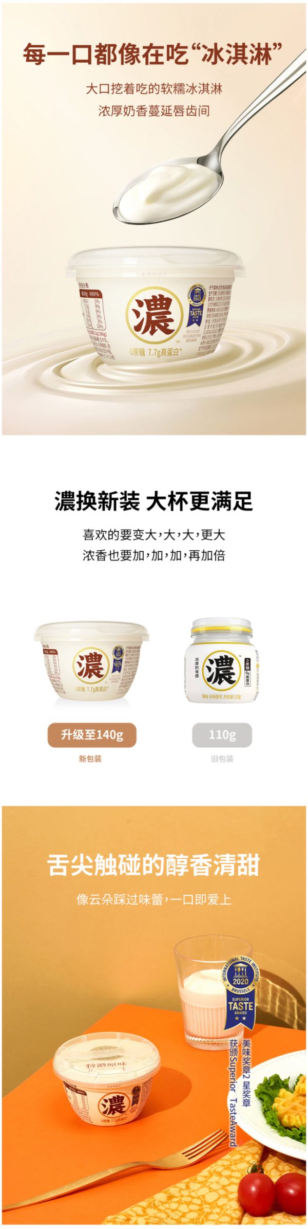 这款特浓酸奶,使用纯生牛乳(鲜奶)发酵,拥有7.7g高蛋白含量和182mg/杯高钙,蛋白质含量是国家标准的2.3倍,口感香醇浓厚,无蔗糖的口味非常健康,一杯热量和三分之二苹果相当。