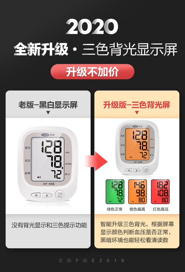 这款可孚 kf65b 上臂式 全自动血压计,佩戴方便,一键检测自动智能加压,精准度更高;高密度聚乙烯外壳,轻巧坚韧,不易变形;全程真人语音播报,语音柔和;而且超大屏幕,易读数,不刺眼;加厚混纺呢龙臂带,搭扣一步到位,加压平稳。