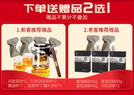 |赠品一:同款茶样*2、15年茯砖茶样*2、飘逸杯*1、品茗杯*2 檀木茶针*1