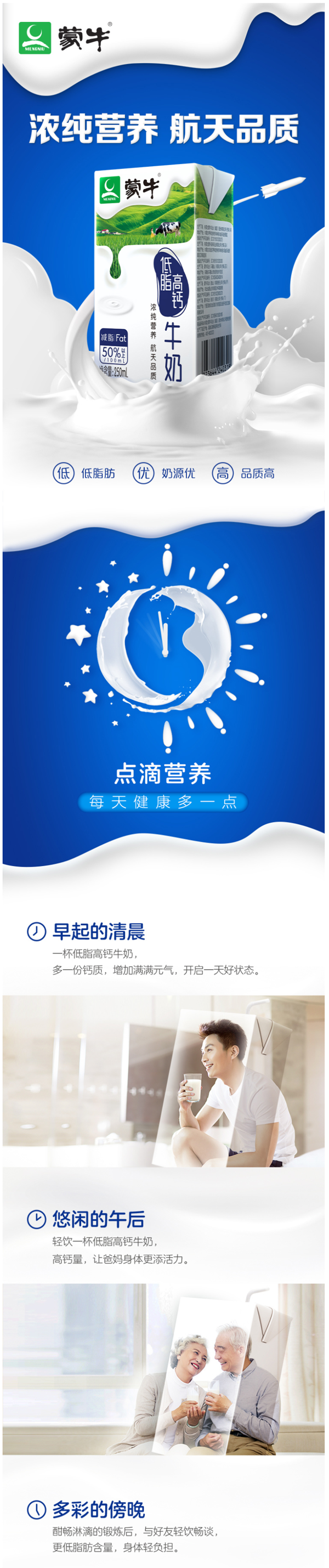 这款蒙牛 低脂高钙牛奶,特点是低脂+高钙+优质蛋白,脂肪含量低于蒙牛高钙牛奶50%以上,还富含维生素D,促进钙的吸收。口感香醇可口,奶味浓郁。