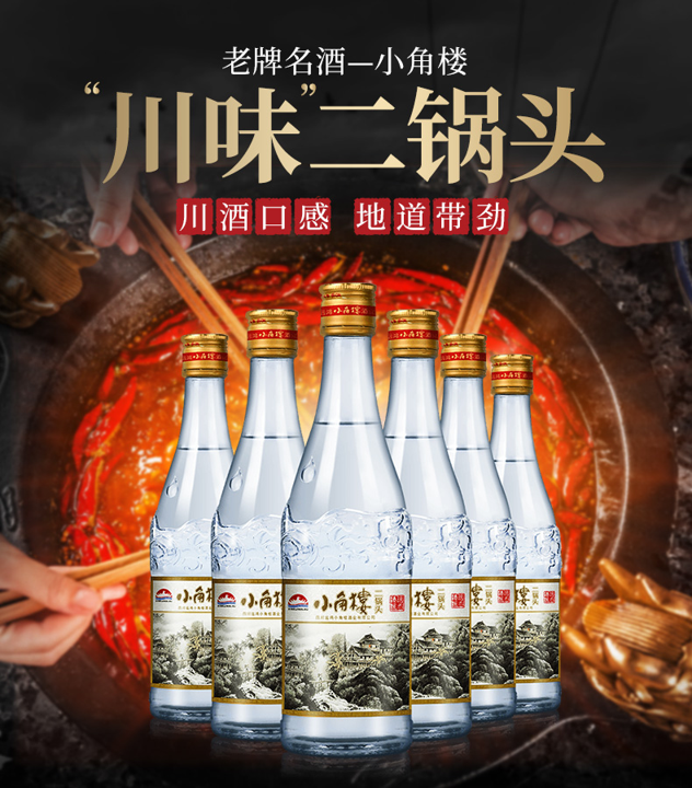 小角楼酿造地处中国白酒金三角区域,1000余万亩原始森林赋予了小角楼白酒“窖香幽雅,陈香怡人,醇厚甘润,自然谐调,爽净适口”的优势产区特色。川味二锅头,地道带劲,纯粮固态,浓香醇正,酒花均匀,清澈透明,绵柔净爽。小角楼二锅头严选当地谷粮,取大巴山脉白衣古镇甘泉活水,经过明清古窖池发酵,按照“老山林,钟乳洞,百年坛”进行陶坛洞藏。