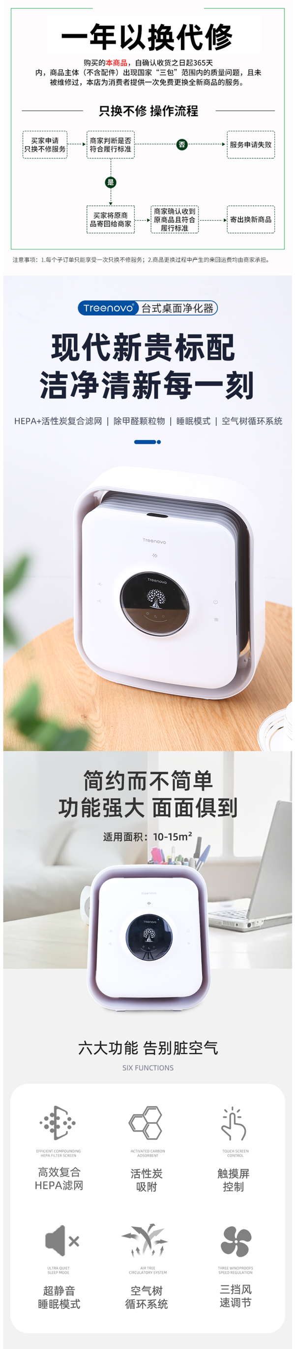 这款Treenovo小型桌面空气净化器,无叶风扇型,内置了HEPA+活性炭复合滤网(初效滤网+活动炭网),能净化甲醛、过敏源和颗粒物、二手烟和异味。