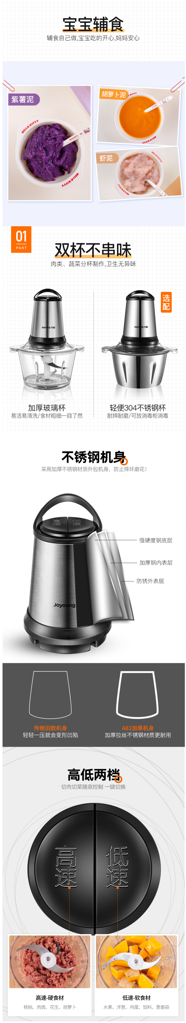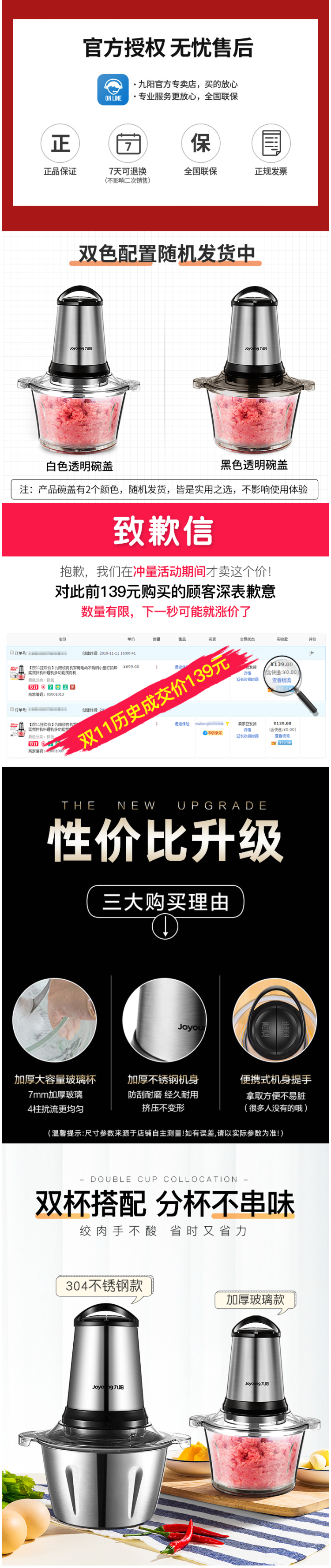 这款九阳 绞肉机质量口碑都非常好。月销量7万+,累计9万4.9好评。可用来搅肉、绞肉、做酱、碎菜、打蛋等。编辑家也备了一个,主要是包饺子做馅料时真是太方便了。一次最大绞肉量可2斤左右,1斤猪肉仅需8秒搅碎。