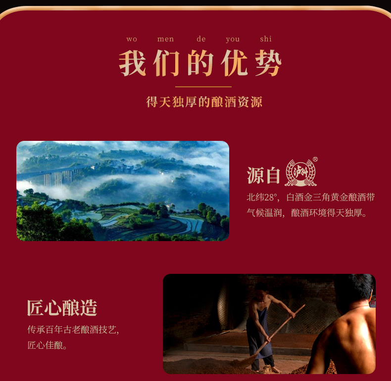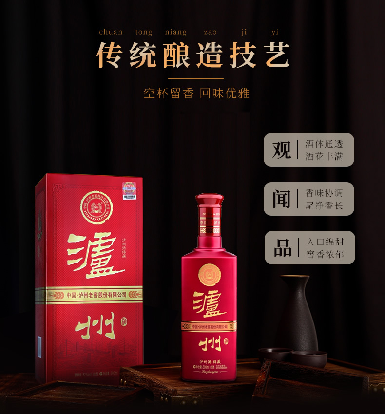 泸州老窖是中国四大名酒之一,采用蒸馏酒酿造工艺,酒质无色透明、窖香优雅、绵甜爽净、柔和协调、尾净香长,风格典型。