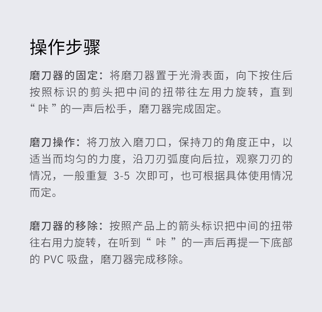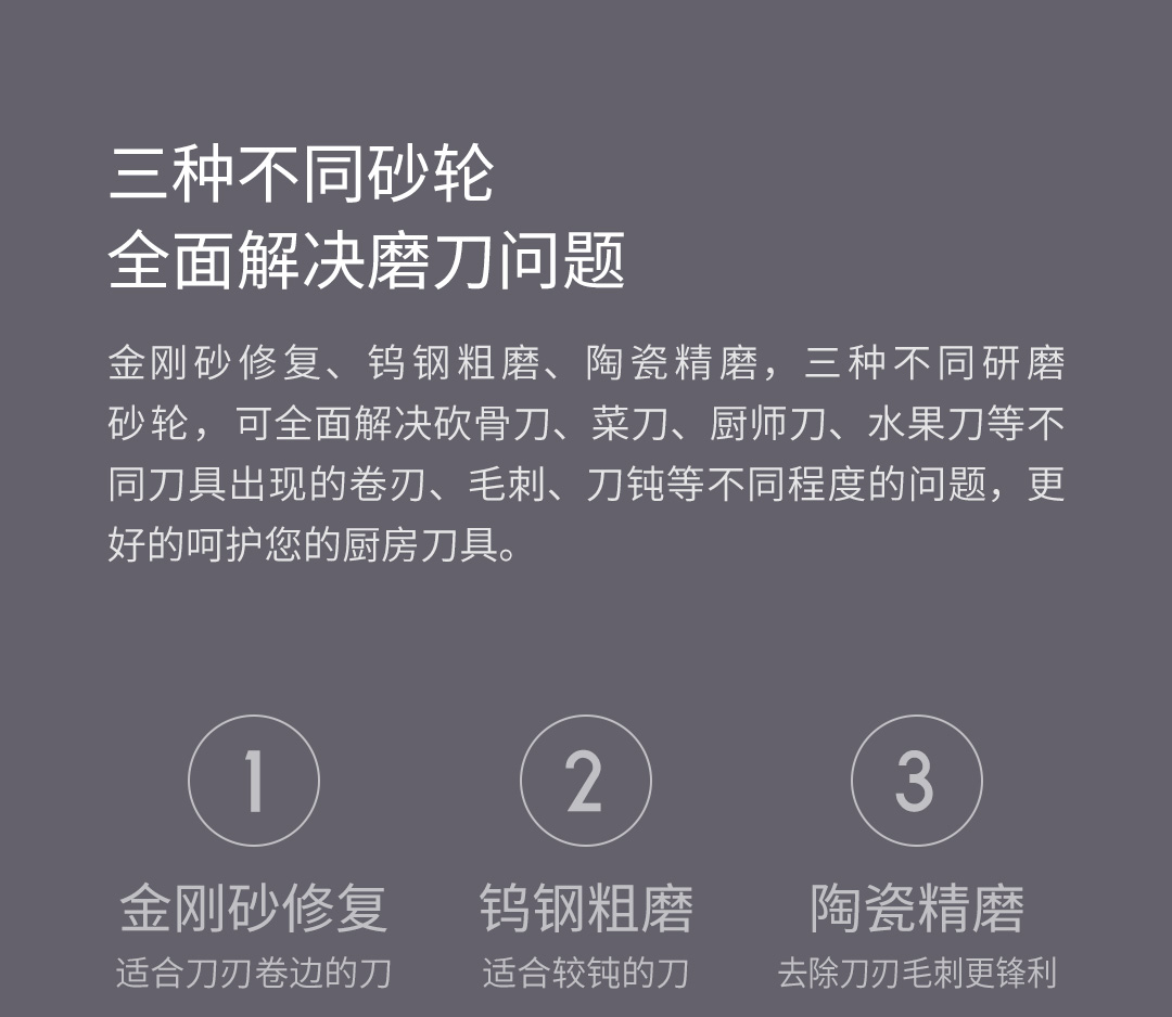 创新三种材质砂轮:金刚砂修复、钨钢粗磨、陶瓷精磨,三种不同研磨砂轮,可全面解决砍骨刀、菜刀、厨师刀、水果刀等不同刀具出现的卷刃、毛刺、刀钝等不同程度的问题,更好的呵护您的厨房刀具。