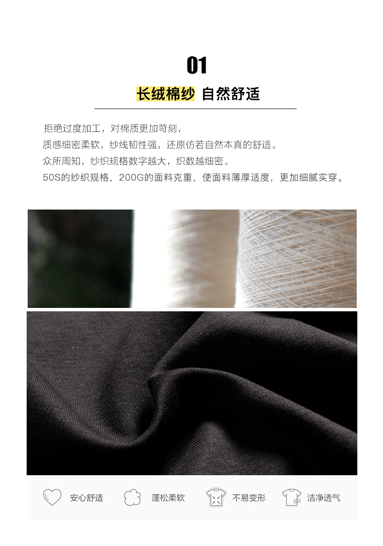 本米纯棉T恤,选用新疆长绒棉,织成200高克重面料,厚薄适中。适合春秋打底穿着。面料未经过化学处理,留有纯棉表面绒绒的质感。