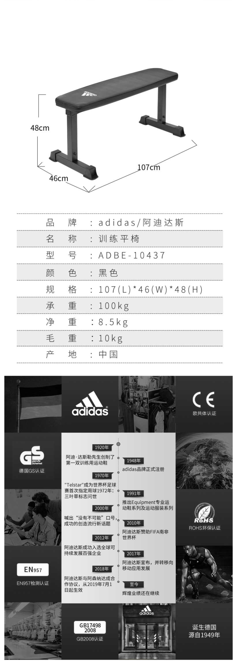 这款阿迪达斯ADBE-10437家用卧推凳,是2020年新款,可以配合完成三角肌训练、小臂肌群训练、肱二头肌训练、肱三头肌训练、胸肌训练。