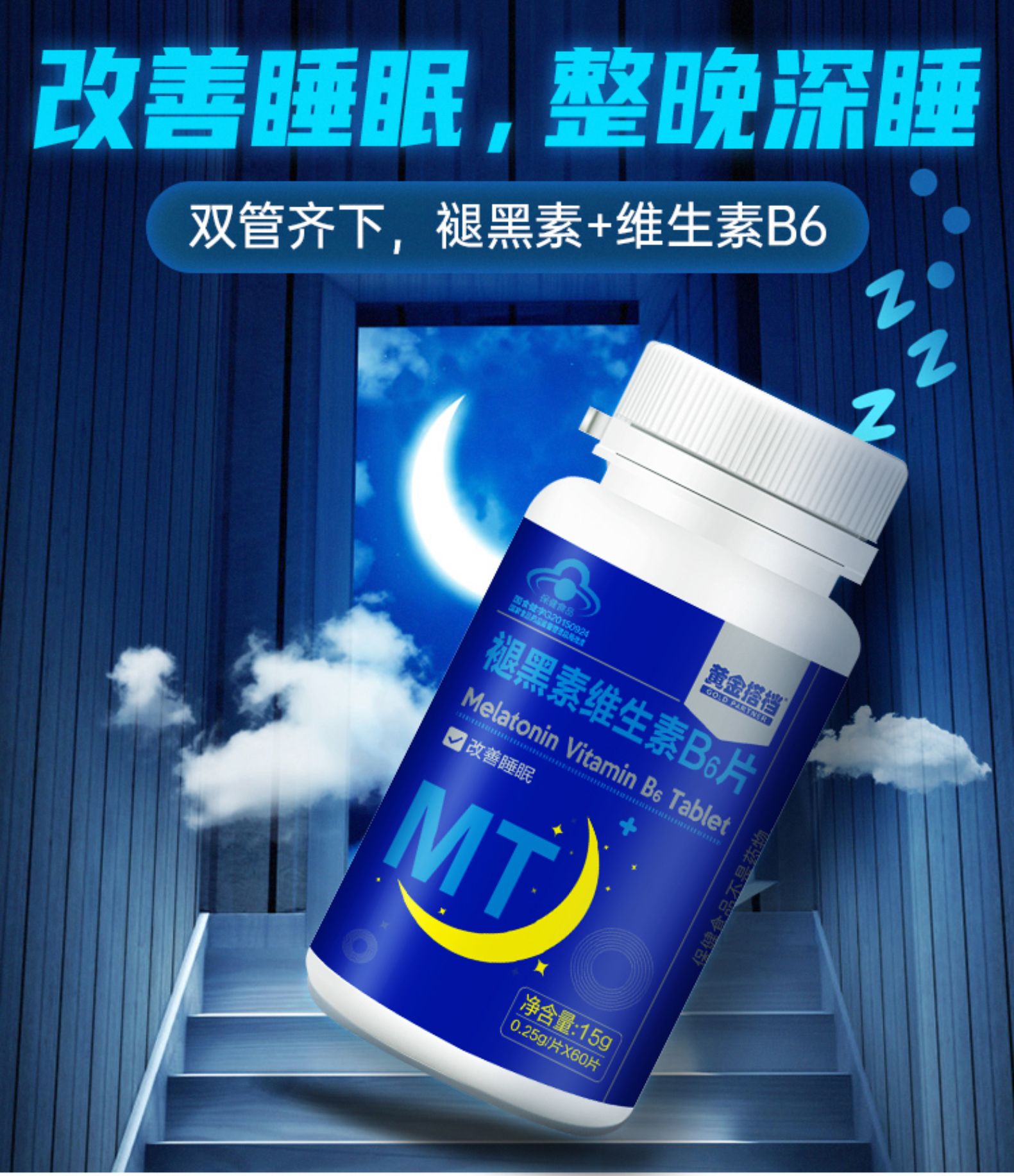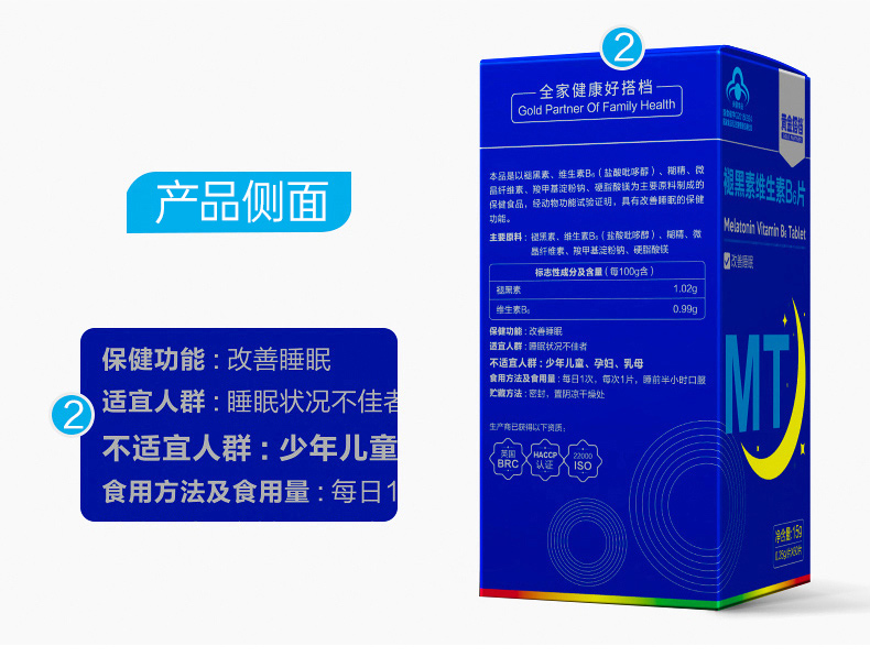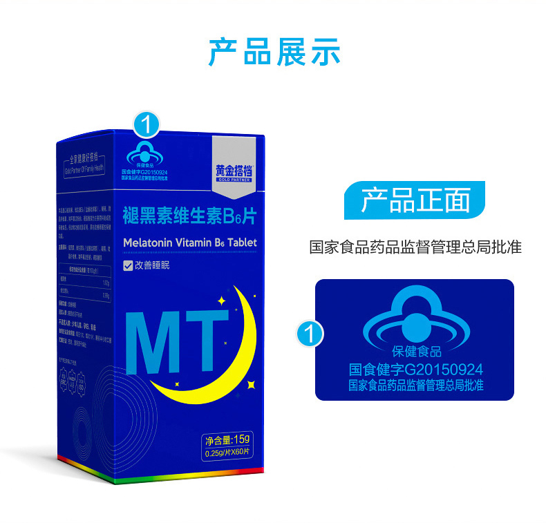 这款褪黑素维生素B6片,适合用于睡眠状况不佳者,每100g含1.02g褪黑素、0.99g维生素B6,可以改善睡眠、快速入睡。退黑素俗称"脑白金",又称"松果体素",是大脑松果腺体在夜间分泌的一种改善睡眠的激素,它不像其他激素那样只能影响某些特定的脏器,而是可以调节体内其他激素的平衡,补充人体内褪黑素可以提高免疫力,调节生理节律,内分泌系统和生殖系统。