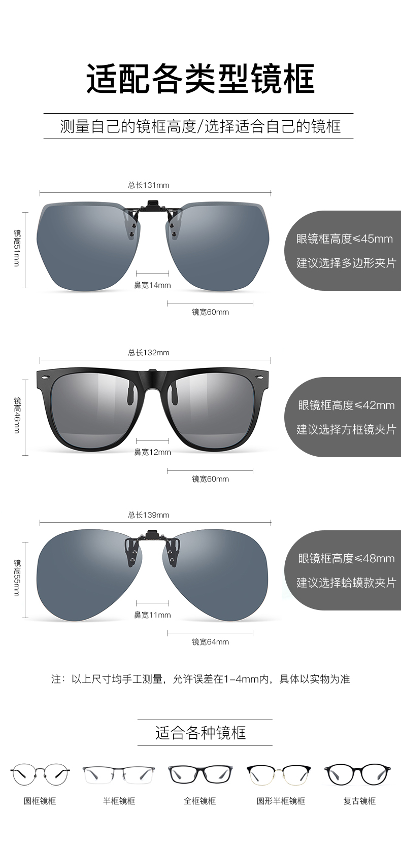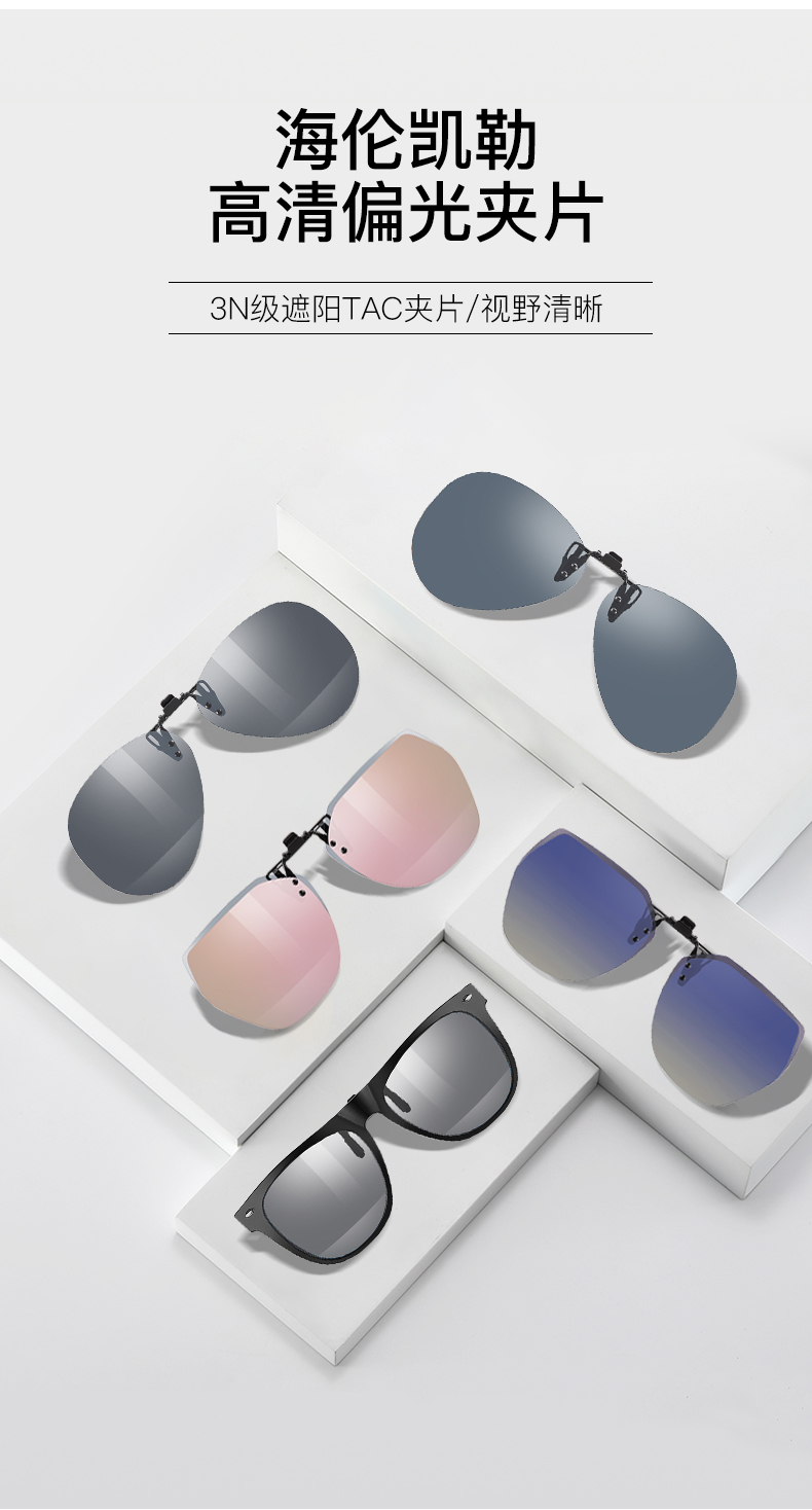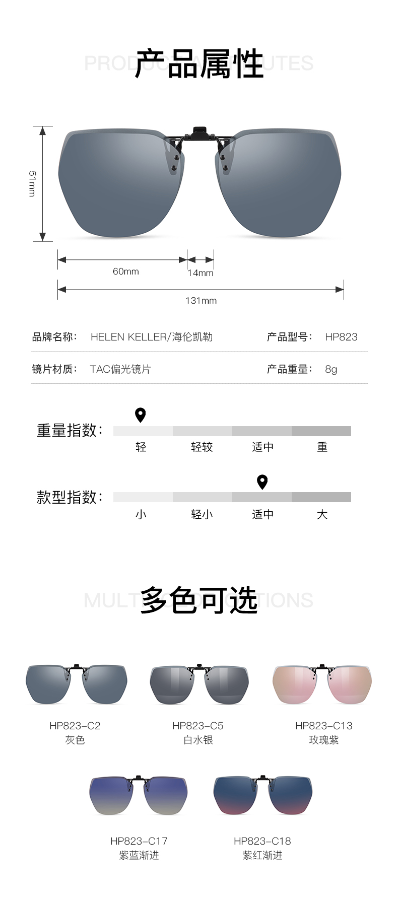 这款Helen Keller 海伦凯勒 805 偏光墨镜夹片,夹片设计,出门携带方便,对于近视用户能够少带一副近视墨镜出门,偏光镜片,有效过滤有害光线。眼镜宽139mm,镜片宽64mm,镜片高55mm。