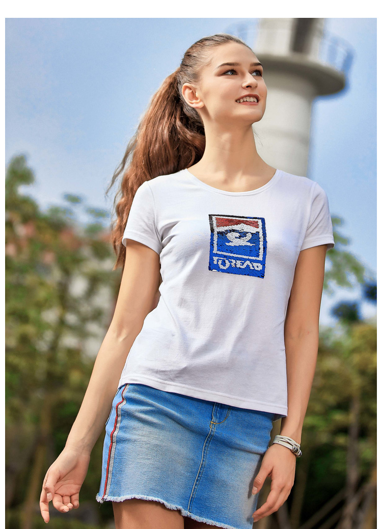 在款式上,修身版型,前胸是亮片绣图案,双面不同的图案,增加趣味性,后领是Logo包边,舒适不摩后颈。