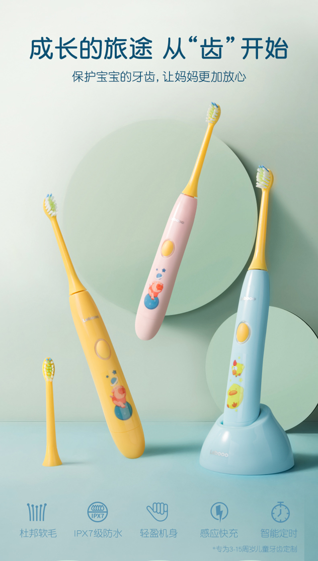 刷头采用0.12mm美国杜邦细软刷毛,柔软抑菌,顶部磨圆设计,柔软不刺激,避免伤害宝宝娇嫩牙龈,深入牙齿缝隙,温柔清洁牙垢;刷毛褪色提示,月3个月出现褪色,提醒更换,保持卫生使用更安心。